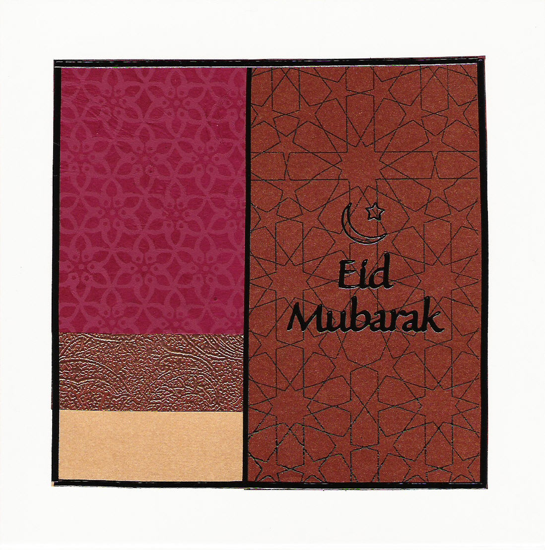 Bronze pearlescent paper embossed in black with an Islamic geometric design. This has been offset with a panel of maroon block printed handmade paper, hand embossed paper and gold metallic paper.