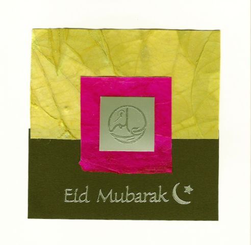 A subtle light green paper made from real leaf fibre is offset with black paper, a deep magenta handmade paper in the centre, with a silver square hand embossed with in Arabic with the word Ilm (knowledge).